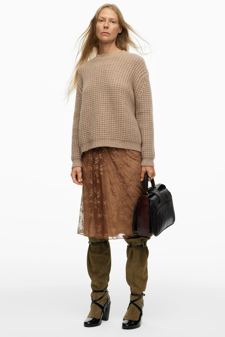 This is the kind of sweater that can make you look elegant even while you`re at home. You can accessorize it with simple gold jewelry to compliment the brownish beige color.